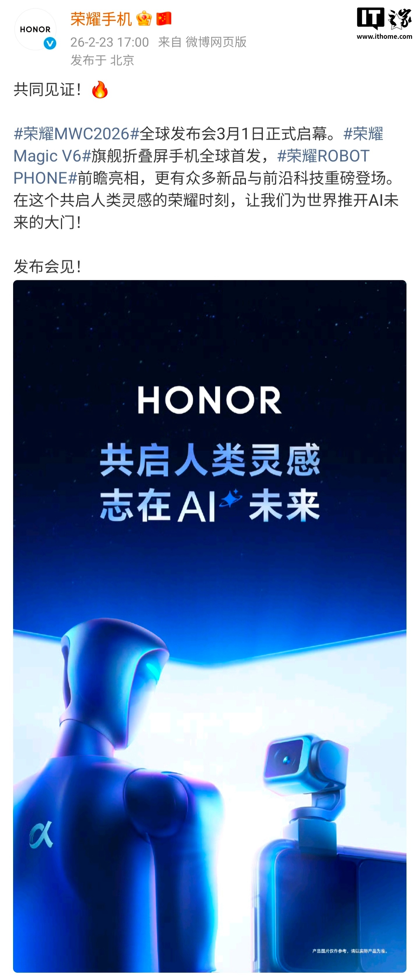 IT之家 2 月 23 日消息,荣耀手机今日宣布,荣耀 MWC 2026 全球发布会 3 月 1 日正式启幕。荣耀 Magic V6 旗舰折叠屏手机全球首发,荣耀 ROBOT PHONE 前瞻亮相,更有众多新品与前沿科技重磅登场。