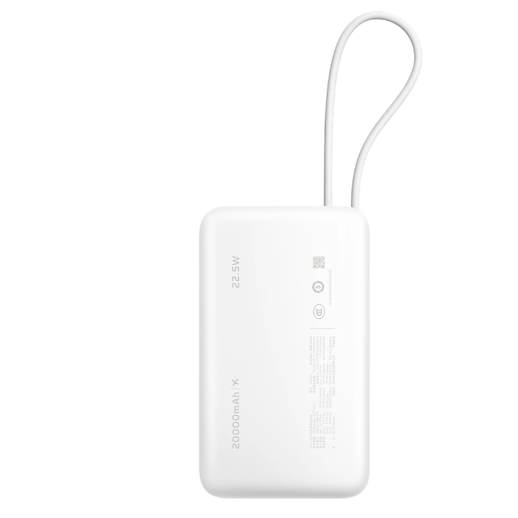 该充电宝拥有 20000mAh 容量,可上飞机,配有一体式快充线,支持 45W 双向闪充。