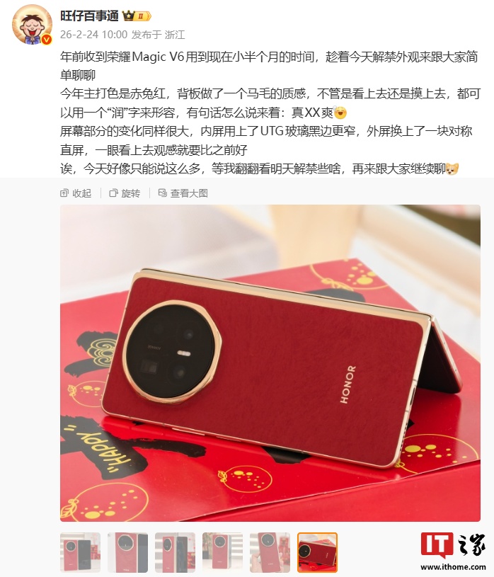博主 @旺仔百事通 今日发文透露,荣耀 Magic V6 今年主打色是赤兔红,背板做了马毛的质感,手感和观感都可以用“润”字来形容。
