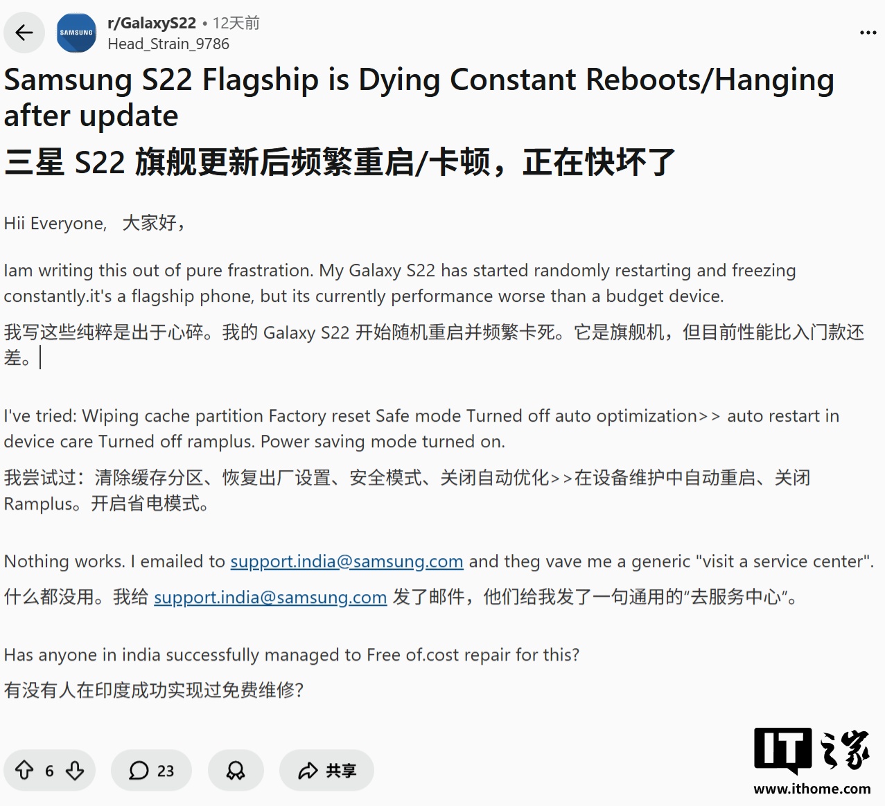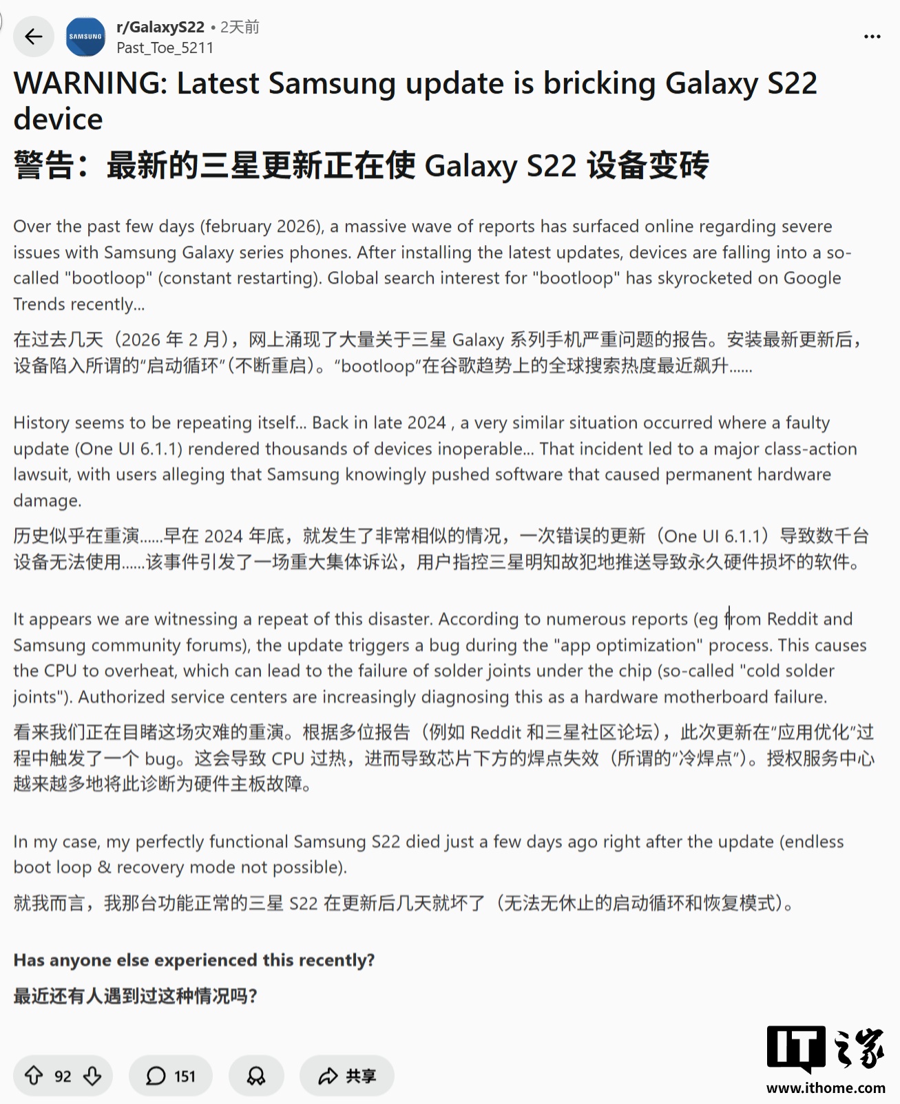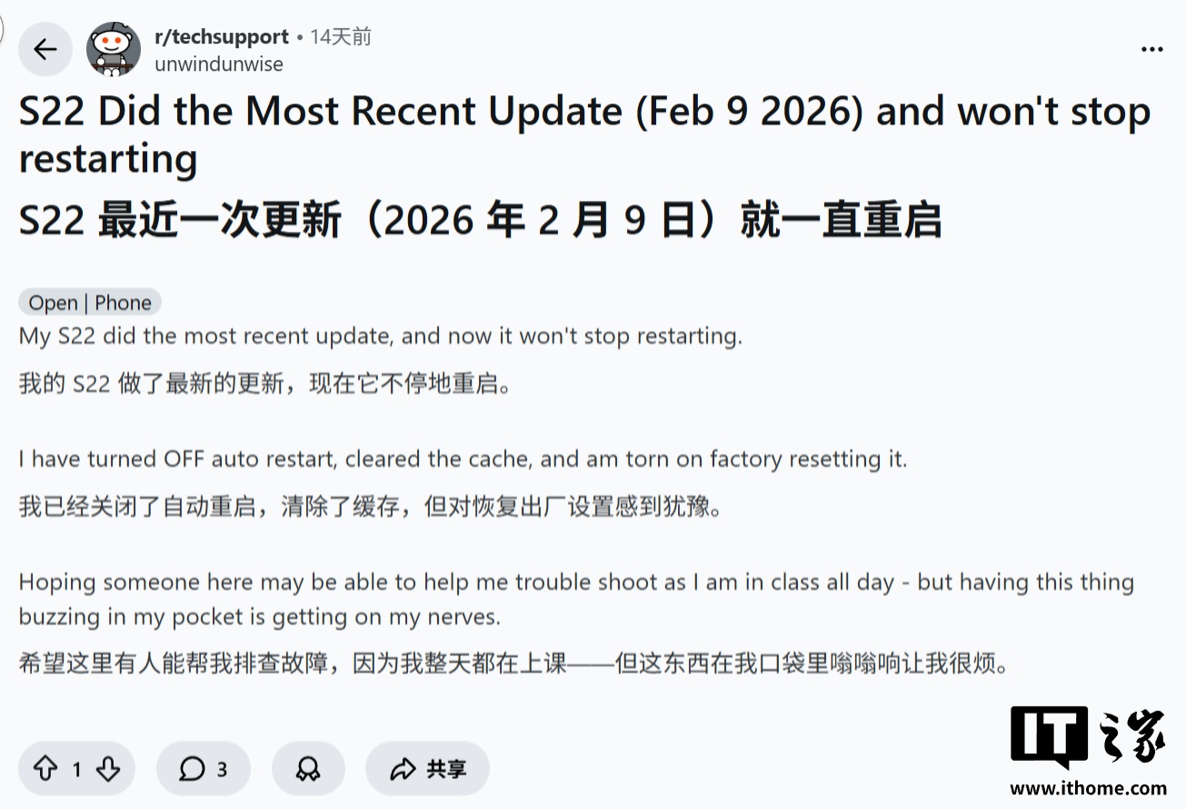 根据 Reddit 社区用户反馈,Galaxy S22 标准版、Galaxy S22+、Galaxy S22 Ultra 手机均受影响,手机在安装更新后会一直卡在三星 LOGO 界面并频繁重启。IT之家附上相关反馈截图如下: