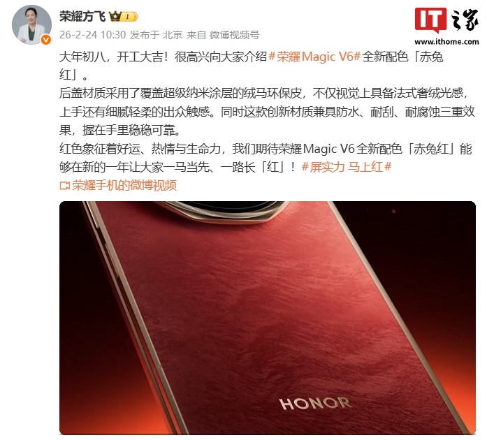 IT之家 2 月 24 日消息,荣耀 Magic V6 折叠屏手机今日正式官宣,新机的全新配色 ——「赤兔红」首发亮相。