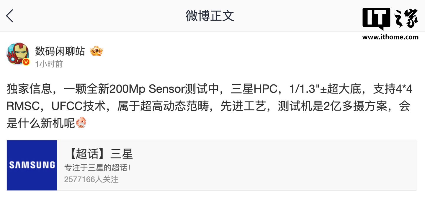 IT之家 2 月 24 日消息,博主 @数码闲聊站 今天在微博透露,某厂正在测试一颗全新 2 亿像素 CMOS 传感器。