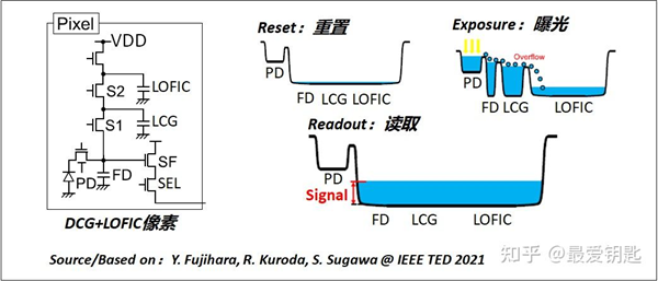 在 LOFIC 加入之后,像素里的光电二极管依然要负责正常成像,只有当画面亮度逐渐升高、接近像素本身的满阱容量时,多出来的电子才会“溢出”到 LOFIC 电容里。