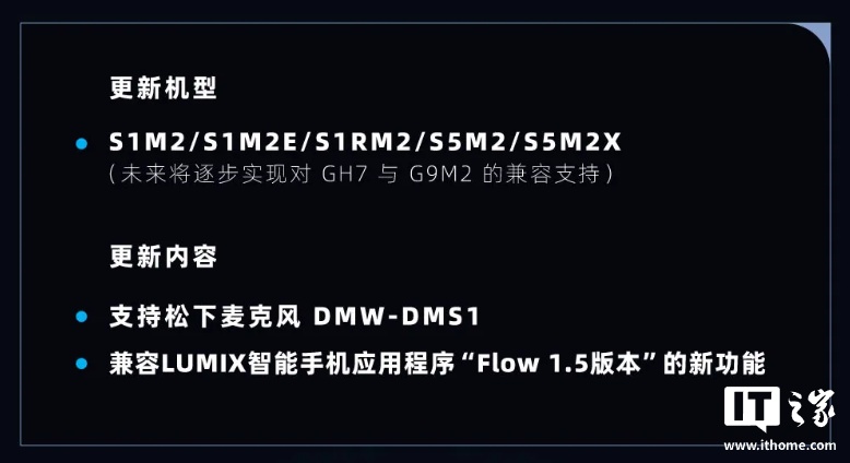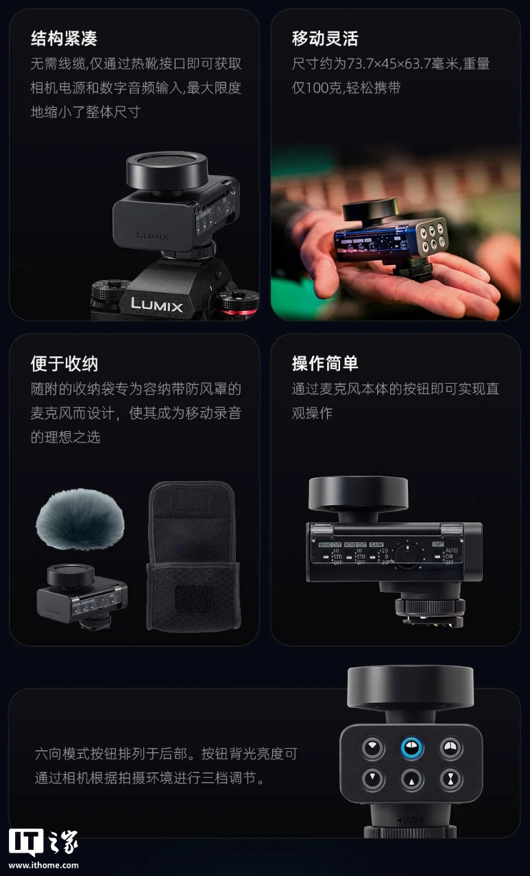 IT之家从官方介绍获悉,DMW-DMS1 目前兼容 LUMIX S5M2 系列、S1M2 系列、S1RM2,未来计划兼容 G9M2 和 GH7。