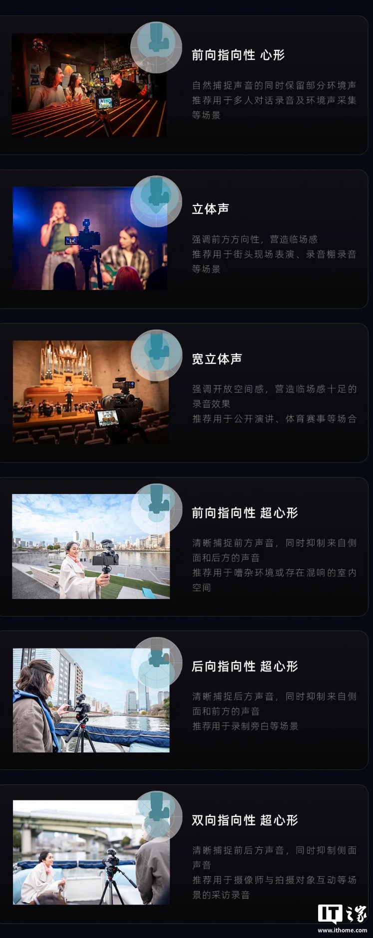 DMW-DMS1 搭载 φ10mm 麦克风阵列,提供 6 种指向模式,包括立体声、宽立体声、前向心形、前向超心形、后向超心形、双向超心形。