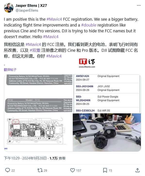 IT之家 10 月 8 日消息,科技媒体 notebookcheck 昨日(10 月 7 日)发布博文,报道称大疆 Mavic 4 无人机通过 FCC 认证,其中“JV31”为 Cine 版本,而“JV32”为 Pro 版本。
