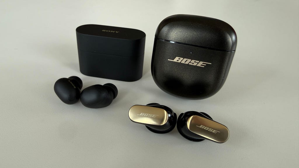 我花了几小时比较索尼WF-1000XM6(左)和Bose QuietComfort Ultra Earbuds(第二代)。David Carnoy/CNET