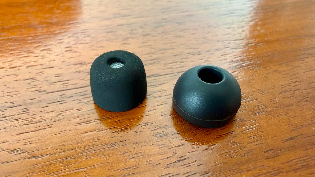 左边是索尼的耳塞,右边是我自己的耳塞。换上我自己的耳塞并获得紧密密封后,音质和降噪效果都有所提升。David Carnoy/CNET