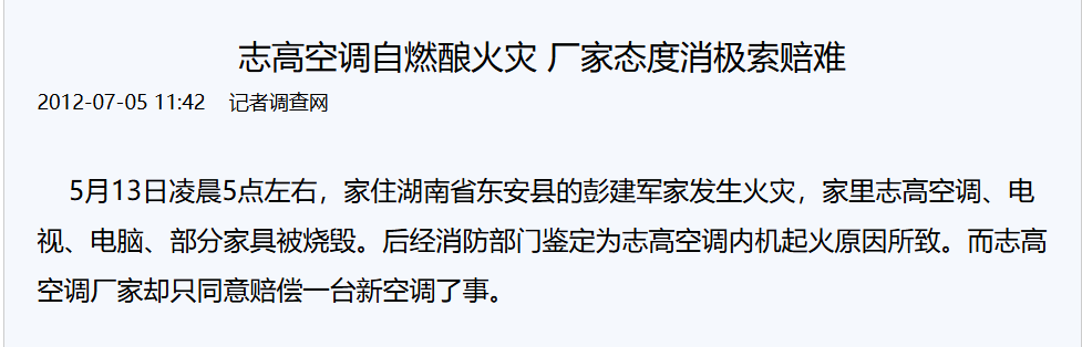 在这几年,志高空调也不止一次出现自燃起火事件等。至今,在黑猫投诉平台上,仍有不少消费者投诉志高空调不能制冷/制暖、售后服务差等。