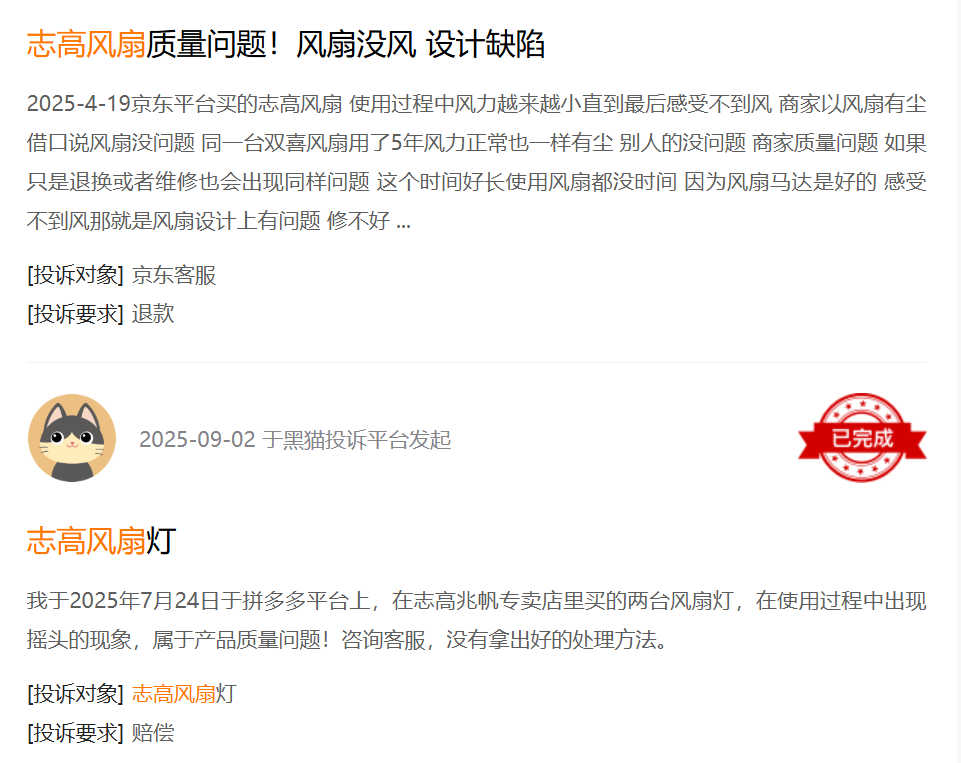 另一方面,“新志高”虽然只聚焦于空调业务,但“志高”仍然是历史债务的“壳”。过去,公司将“志高系”商标授权给若干家电小厂,在黑猫投诉平台上,这些小家电质量问题频出,也在进一步稀释“新志高”的品牌公信力 。