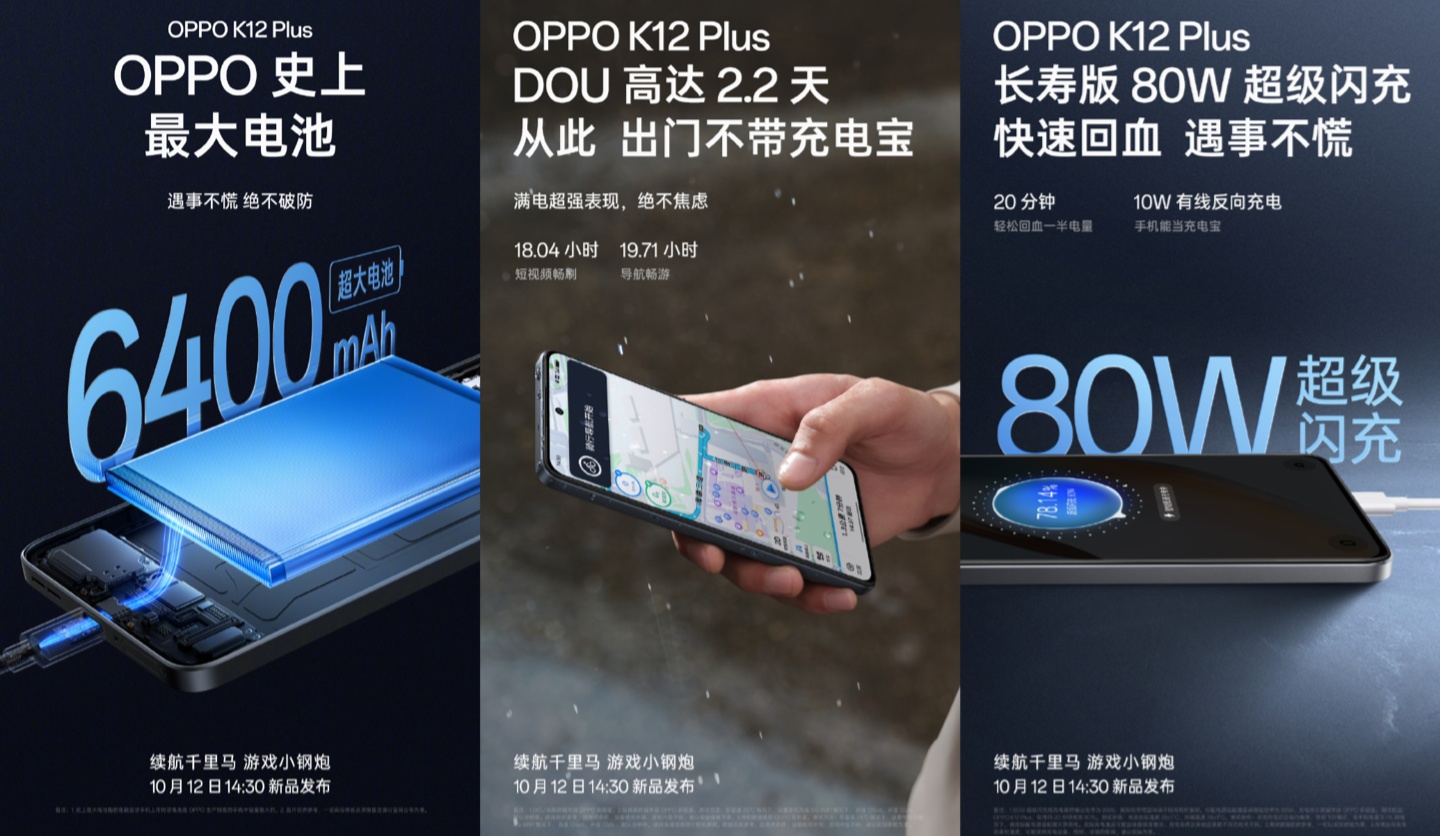OPPO 官方对该机进行预热:K12 Plus 手机将配备 6400mAh 电池,号称“ OPPO 史上最大电池”,官方宣称“DOU 达 2.2 天”;新机还将支持 80W 闪充和 10W 有线反向充电。