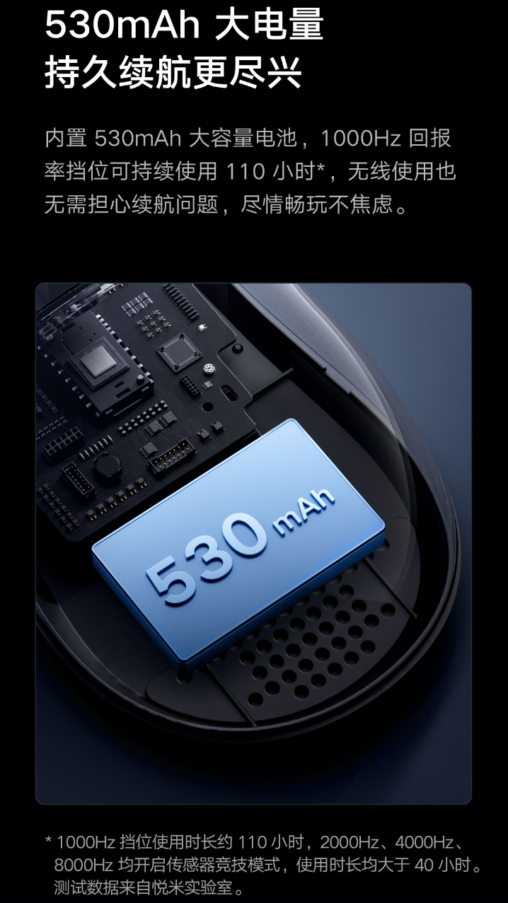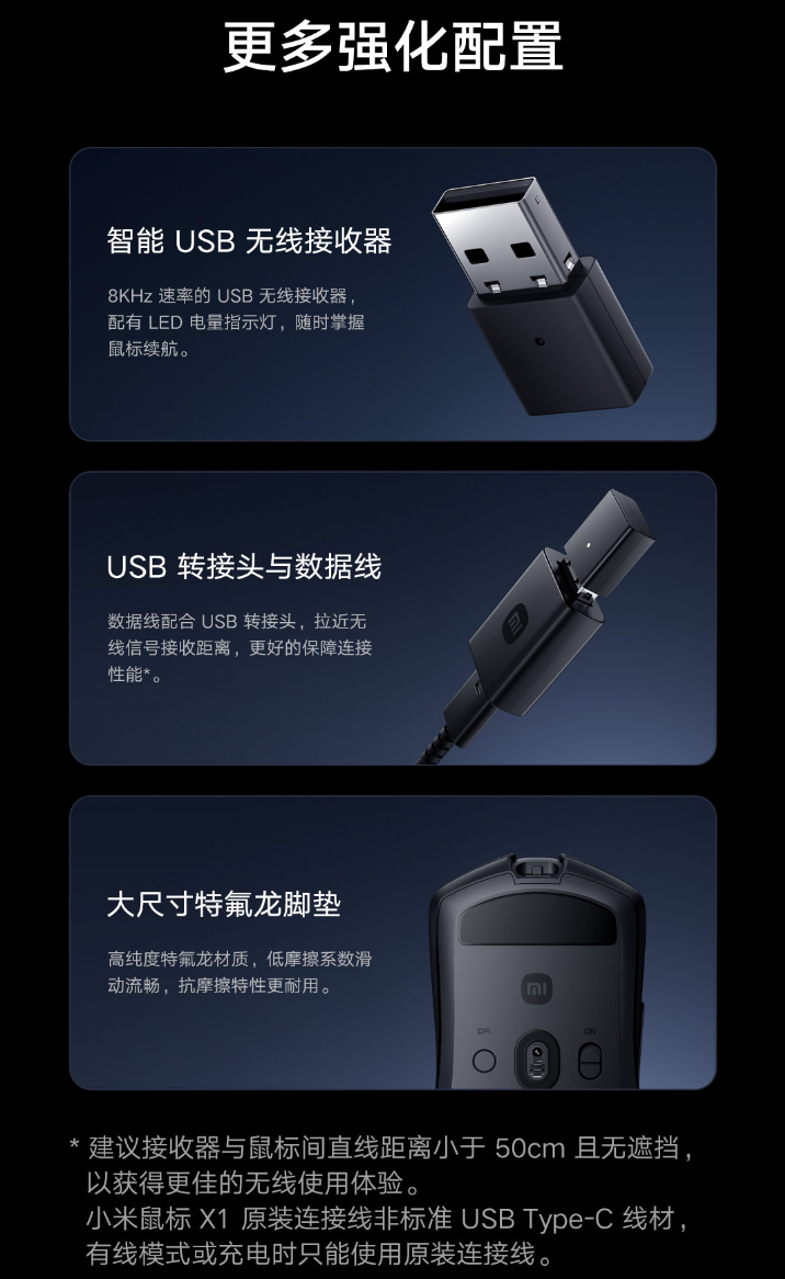 小米鼠标 X1 还内置 530mAh 电池,1000Hz 回报率档位可持续使用 110 小时;鼠标按键配备 TTC 特调电子竞技微动开关,底部设有五档 DPI 调节按键。
