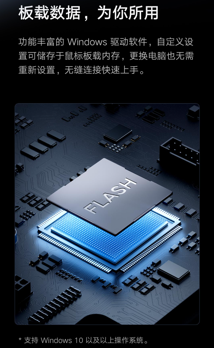 该鼠标还配有智能 USB 无线接收器、USB 转接头与数据线、大尺寸特氟龙脚垫,官方提供 Windows 驱动软件,自定义设置可存储于鼠标板载内存。