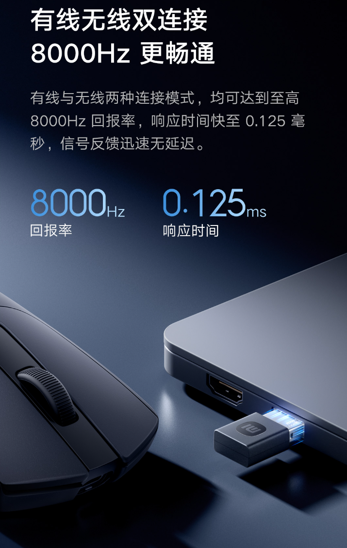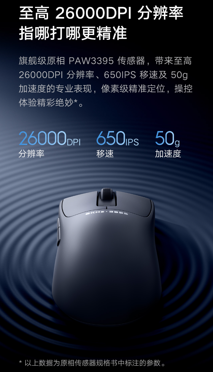 该鼠标拥有白雾和黑墨双配色,支持有线 / 无线双模连接,回报率均至高 8000Hz,响应时间 0.125ms。鼠标配备原相 PAW3395 传感器,该传感器可提供至高 26000DPI,移速 650IPS,加速度 50g。