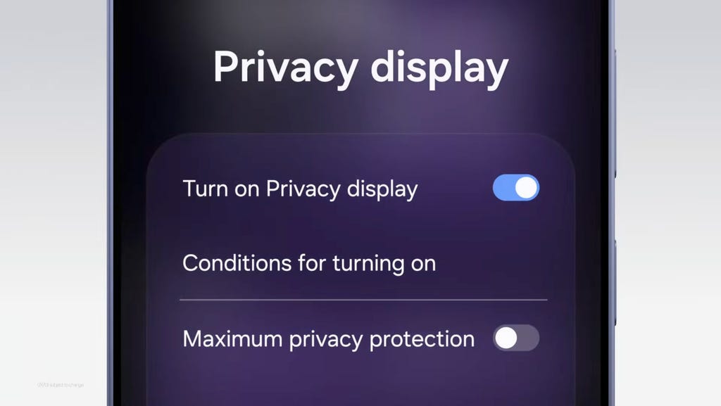 隐私显示功能在竖屏与横屏模式下均可使用。它通过一种特殊方式分散像素光线,使得非正对屏幕观看时,屏幕部分区域会变暗。您可以选择将其应用于特定应用、通知,或在输入PIN码或密码时启用。通过快速设置,您可随时随地轻松开启或关闭此功能,例如在公交车上怀疑有人偷窥您屏幕时。