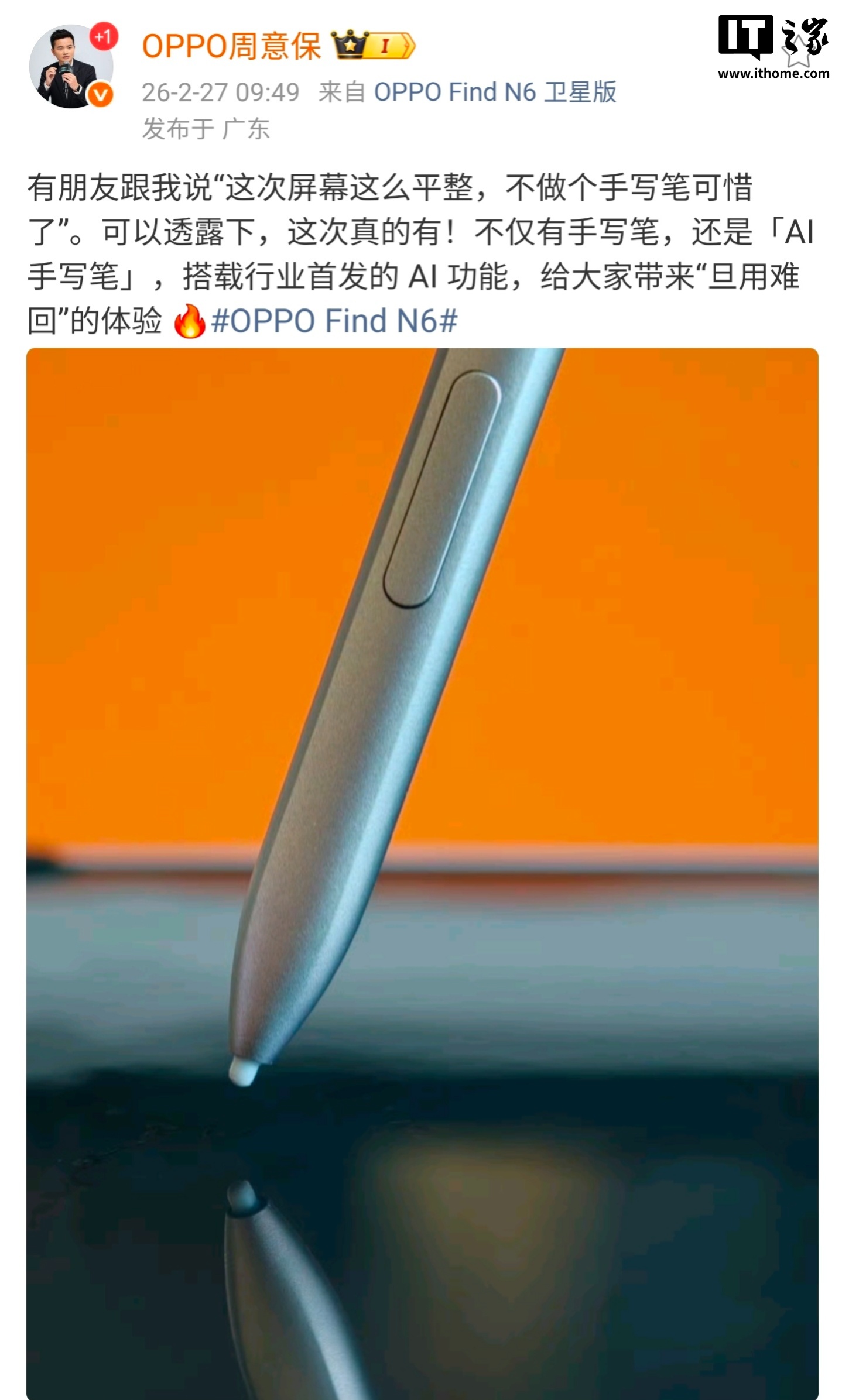IT之家 2 月 27 日消息,OPPO Find 系列产品负责人周意保今日透露,OPPO Find N6 不仅有手写笔,还是“AI 手写笔”,搭载行业首发的 AI 功能,给大家带来“旦用难回”的体验。