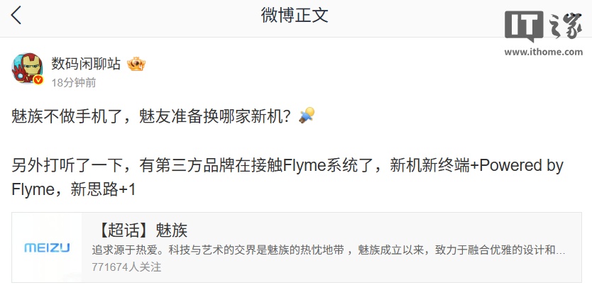 博主 @数码闲聊站 表示,有第三方品牌在接触 Flyme 系统了,新机新终端 +Powered by Flyme,新思路 +1。