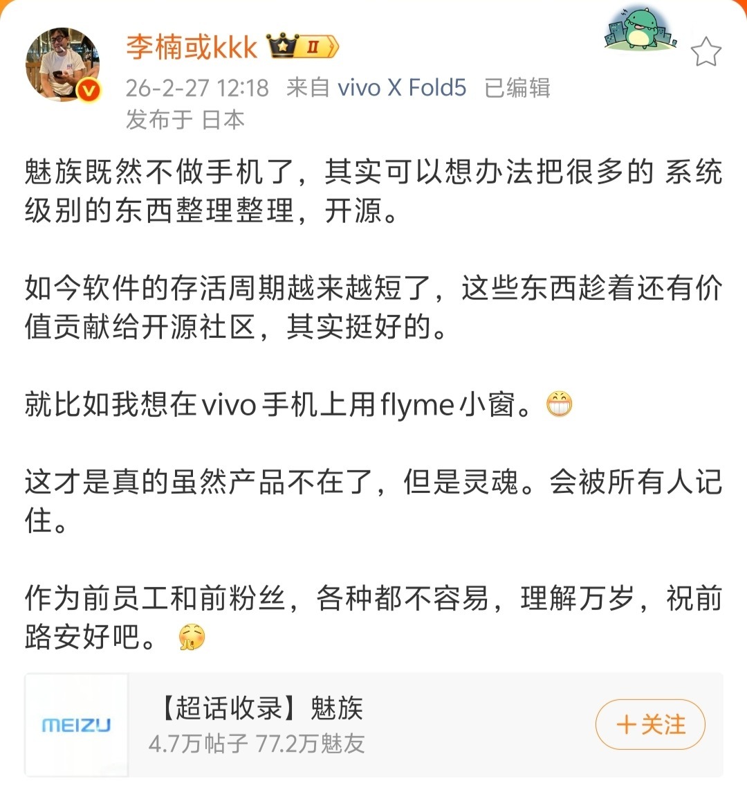 李楠还称:魅族既然不做手机了,其实可以想办法把很多的系统级别的东西整理整理,开源。