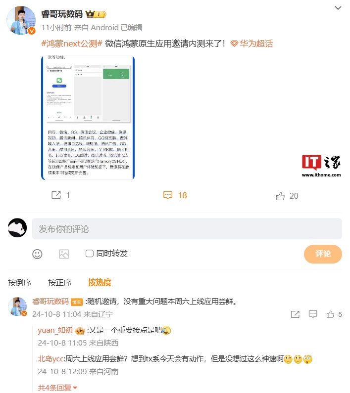 IT之家今日早些时候报道,腾讯 WXG(微信事业群)员工 @客村小蒋 在微博针对微信鸿蒙原生版应用的问题进行解答。其中对于应用上线、内测情况回复如下: