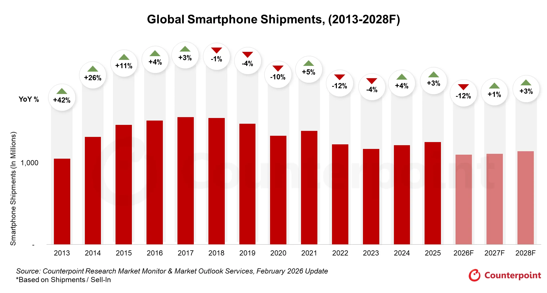 2月27日,市调机构Counterpoint Research预测,到2026年,全球智能手机出货量将跌破11亿部,为2013年以来的最低水平。核心驱动因素是内存供应紧张状况迅速恶化。预计2026年第二季度移动LPDDR4/5内存价格将达到2025年第三季度的近三倍,这反映出供应正面临前所未有的紧缩。