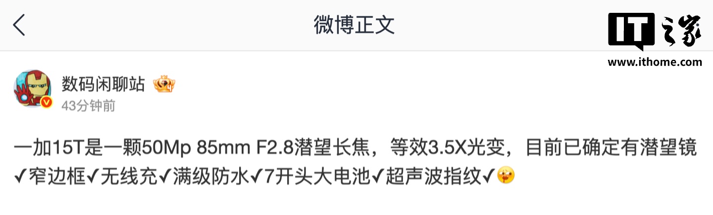 IT之家 2 月 28 日消息,博主 @数码闲聊站 今天在微博透露,一加 15T 手机将搭载 5000 万像素 85mm F2.8 潜望长焦镜头。
