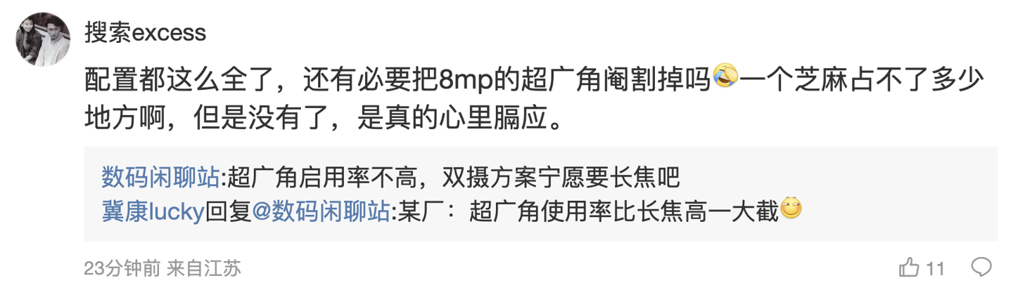 后续有用户在评论区表示:“配置都这么全了,还有必要把 8mp 的超广角阉割掉吗一个芝麻占不了多少地方啊,但是没有了,是真的心里膈应。”,博主回复道:“超广角启用率不高,双摄方案宁愿要长焦吧”。