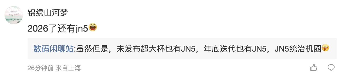 另一名用户则询问道:“2026 了还有 jn5”,博主则回复道:“虽然但是,未发布超大杯也有 JN5,年底迭代也有 JN5,JN5 统治机圈”。
