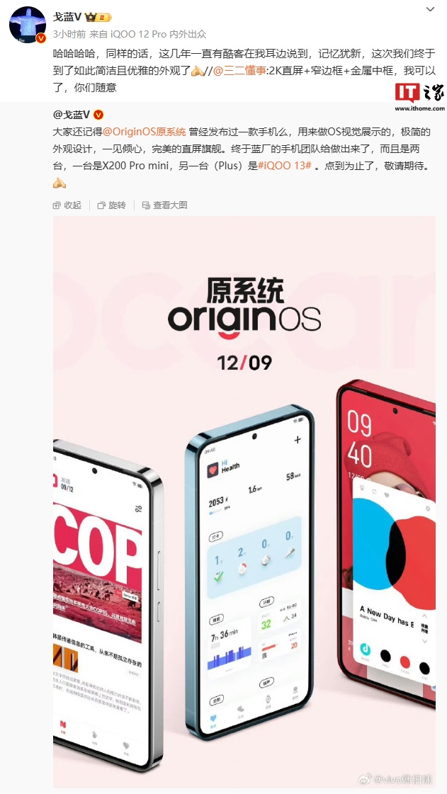 IT之家 10 月 9 日消息,iQOO 产品经理 @戈蓝V 昨日发文对 iQOO 13 的外观进行透露,结合他与网友互动来看,新机预计将采用直屏 + 窄边框 + 金属中框设计,整体外观类似此前 OriginOS 视觉展示机型。