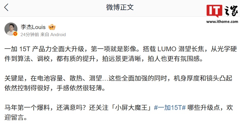 IT之家 3 月 2 日消息,一加中国区总裁李杰今日开启了一加 15T 小屏手机的预热。他表示,这款新机产品力全面升级,影像方面搭载 LUMO 潜望长焦,宣称从光学硬件到算法、调校,都有质的提升。
