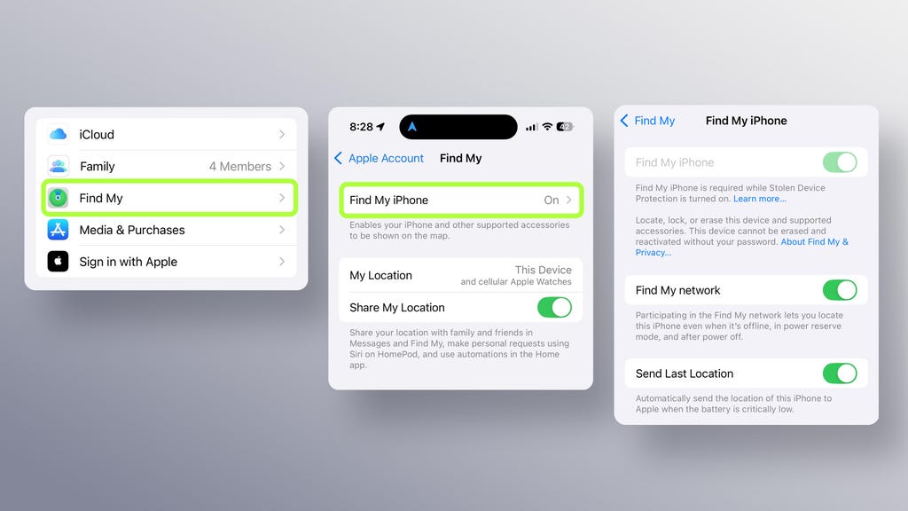 如何在iPhone上开启“查找我的网络”并发送最后位置信息。Lisa Eadicicco/Viva Tung/CNET