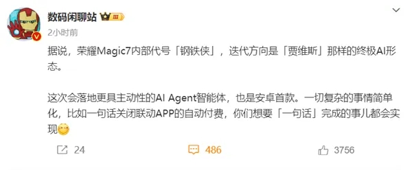 《流浪地球》中的MOSS、《钢铁侠》中的贾维斯等是人类可靠的帮手,可以帮助我们完成许多工作,也是人类对于AI的幻想与期待。@数码闲聊站爆料称,荣耀Magic 7系列内部代号“钢铁侠”,迭代方向便是贾维斯,科幻电影中的AI,正一步步走进现实世界。
