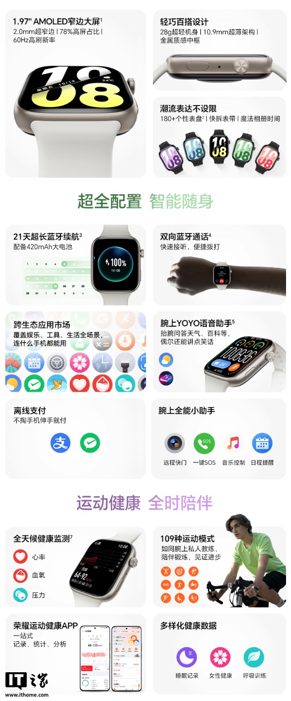 该手表可选幻夜黑、星光白两种配色,其整体重量为 28g,厚度 10.9mm,配备 1.97 英寸 60Hz AMOLED 面板。