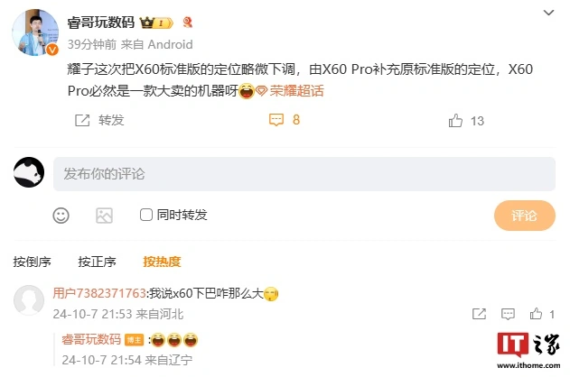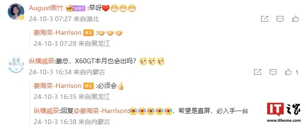 据IT之家此前报道,本月有博主称,荣耀这次把 X60 标准版的定位略微下调,由 X60 Pro 补充原标准版的定位。姜海荣在 10 月 3 日的微博评论区下回复网友关于“X60 GT”机型的推出情况称“必须会”。