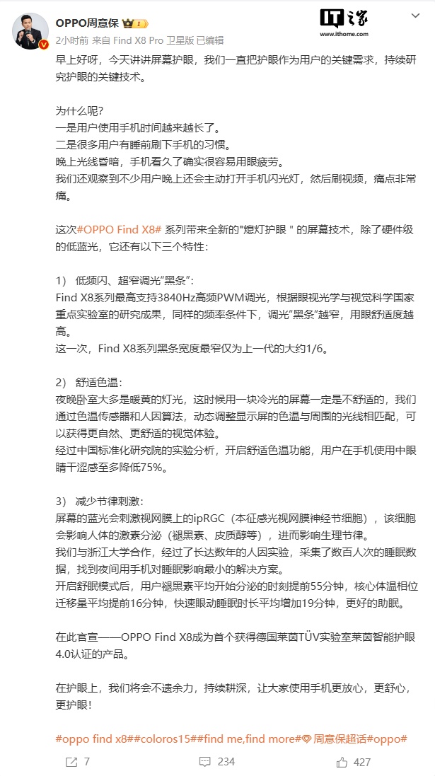 IT之家 10 月 9 日消息,OPPO Find 系列产品负责人周意保今日预告了 Find X8 系列的屏幕护眼功能。