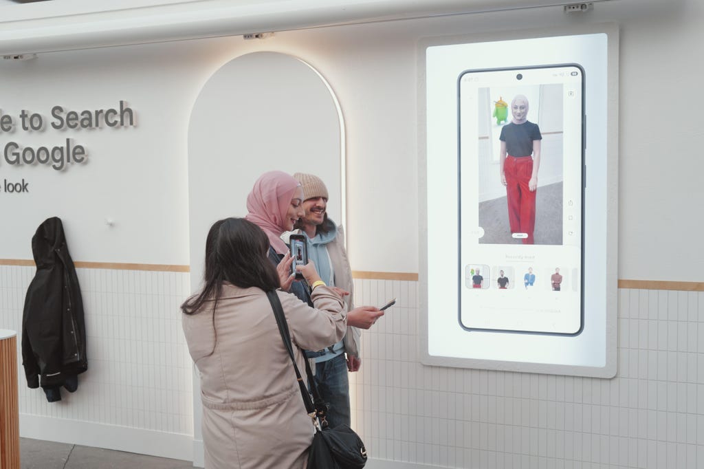 在另一个展位,我体验了谷歌“圈选搜索”的一项更新功能,它能同时识别你屏幕上的所有服饰单品,并让你进行虚拟试穿。