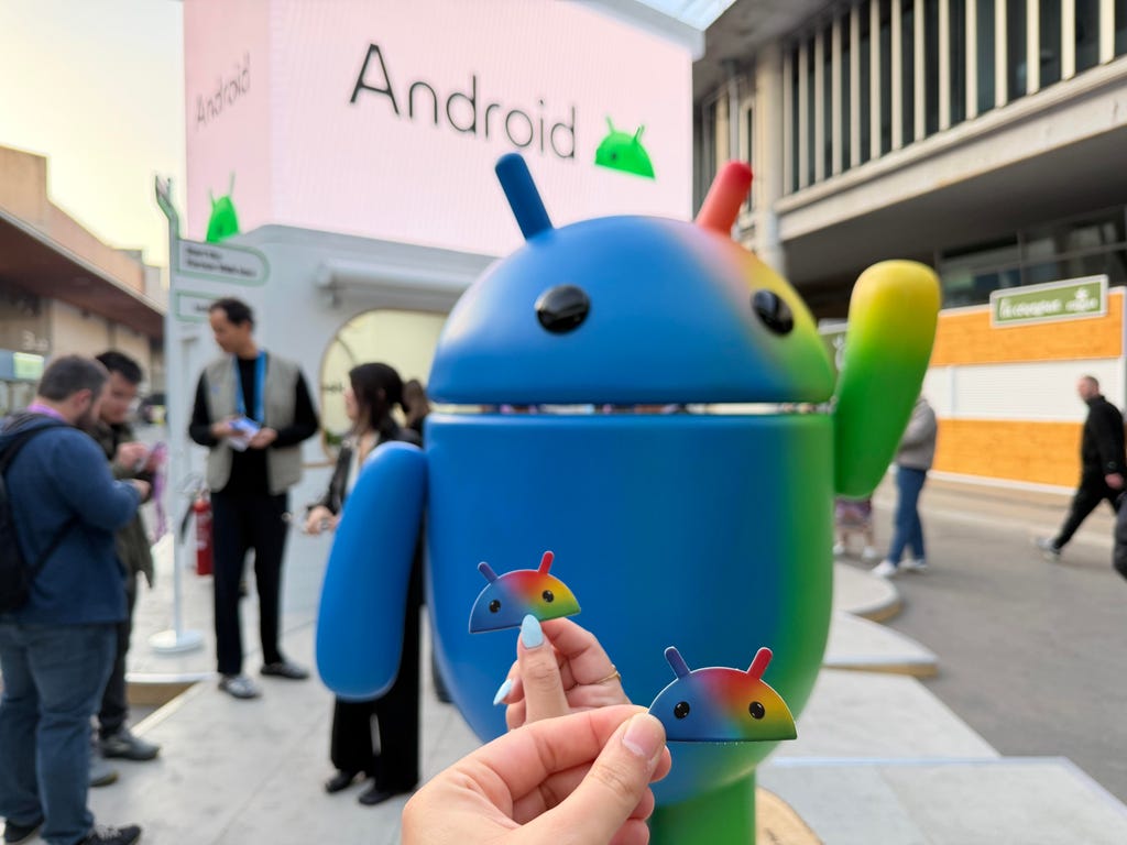 我顺道探访了谷歌的展区,亲身感受了其最新产品与功能的精彩演示。入口处,一尊色彩斑斓、萌态可掬的安卓机器人雕像正挥手致意,瞬间营造出欢快的氛围。