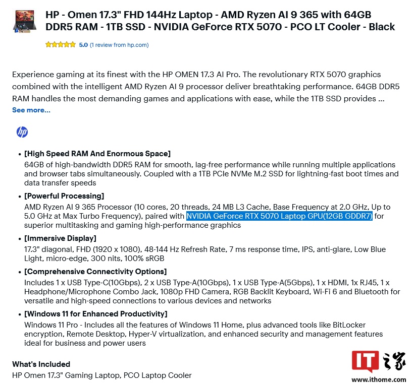 此外,根据外媒 Tom's Hardware 的发掘,华硕、惠普部分 2025 款游戏笔记本电脑在第三方电商平台上也显示了 12GB 版 RTX 5070 Laptop GPU 相关信息。