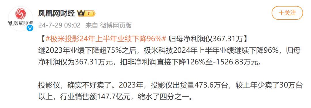 极米投影 24 年上半年业绩下降 96%,归母净利润仅 367.31 万,扣非净利润直接下降 126% 至 -1526.83 万元。