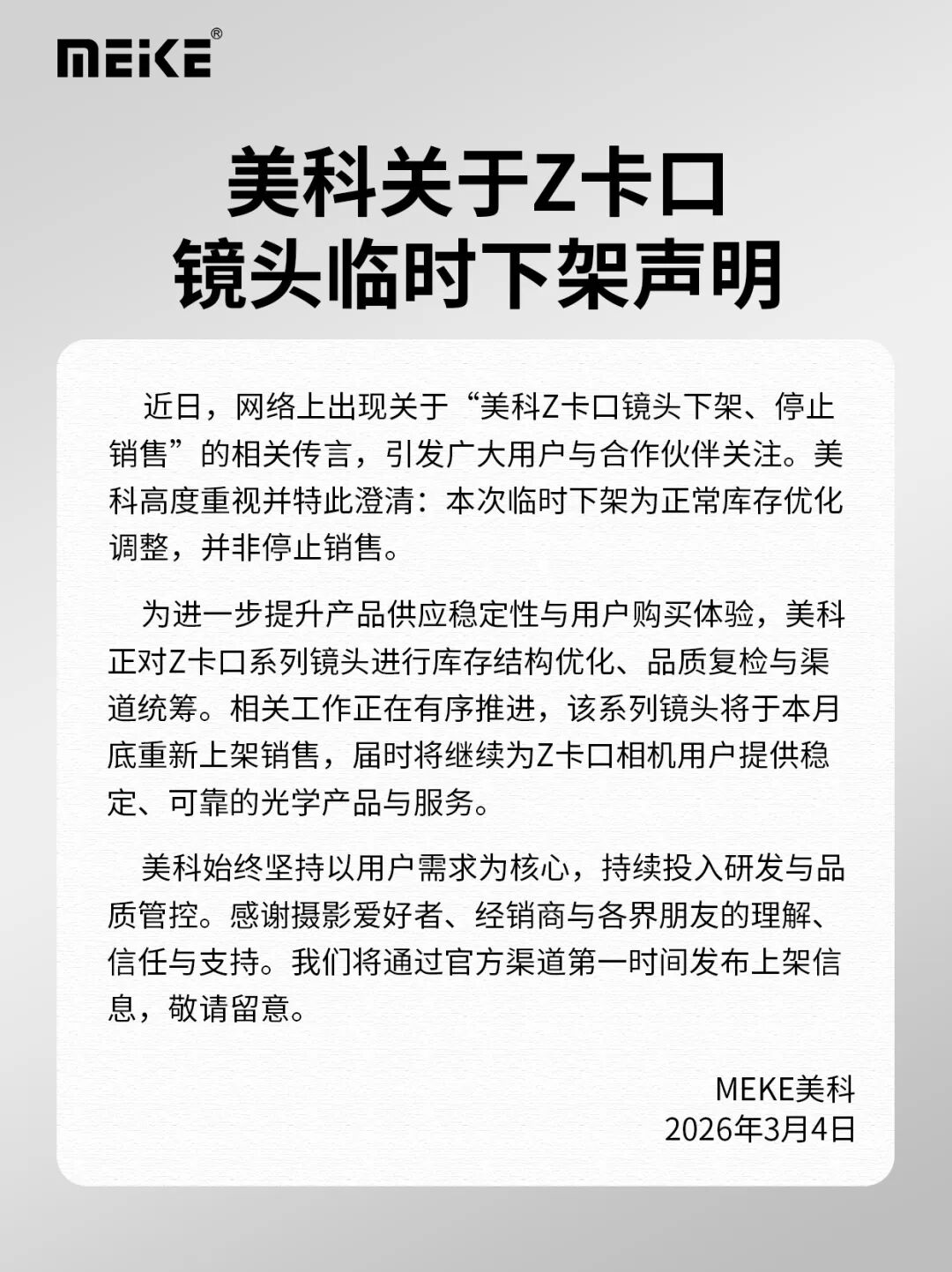 IT之家 3 月 4 日消息,美科今日发布关于 Z 卡口镜头临时下架的声明,表示此次临时下架为正常库存优化调整,并非停止销售。IT之家附全文如下: