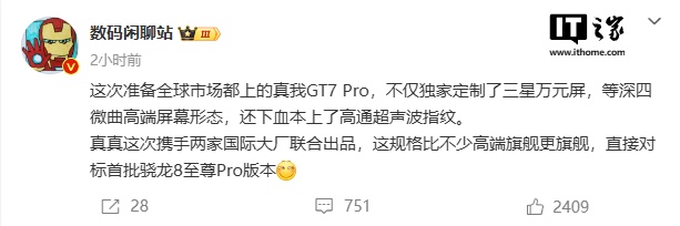 据该博主透露,真我 GT7 Pro 将面向全球市场推出。新机不仅独家定制了三星万元屏,等深四微曲高端屏幕形态,还下血本上了高通超声波指纹。该博主指出,真我此次与三星和高通两大国际巨头合作,新机规格超越了许多高端旗舰机型,能够直接与首批骁龙 8 至尊 Pro 版手机相媲美。
