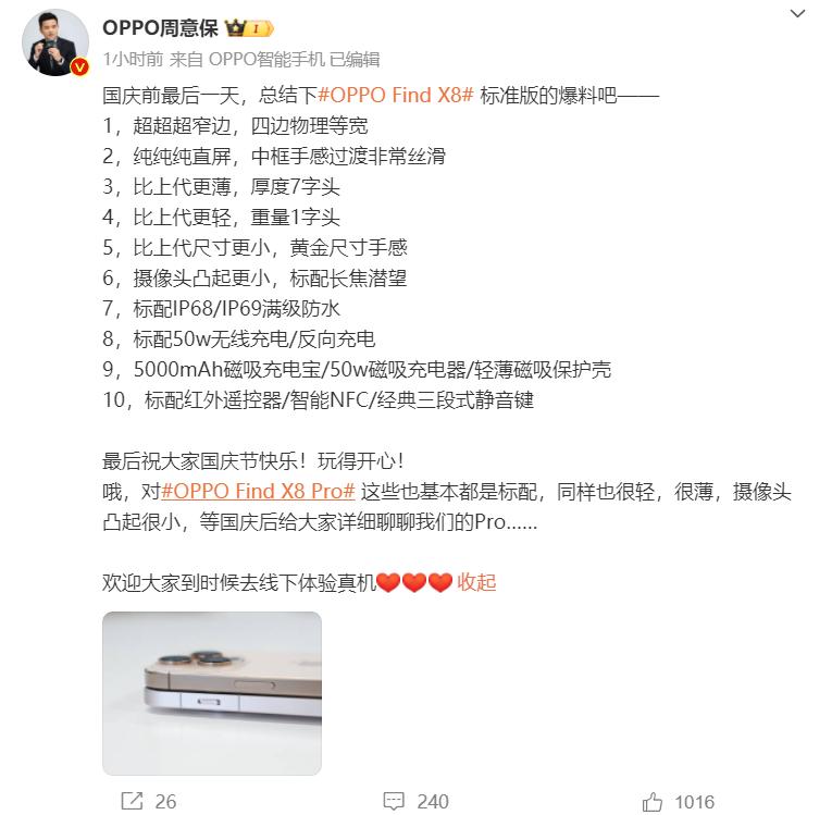 据OPPO Find系列产品负责人周意保透露,Find X8系列标配IP68/IP69防水、潜望式长焦、50W无线充电/反向充电、红外遥控/智能NFC/三段式静音键等配置。OPPO Find X8更是做到了厚度低于8mm,重量低于200g,摄像头凸起缩减到4mm以内。Pro版本因配置较高,重量和厚度会略高,但相较上一代也有不小提升。