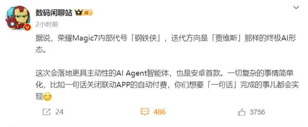 @数码闲聊站曾爆料,Magic 7系列内部代号为“贾维斯”。在科幻电影《钢铁侠》中,贾维斯是钢铁侠的智能助手,负责钢铁侠日常生活、工作、战斗的一切事宜。在前段时间的IFA大会上,荣耀CEO赵明讲述了自己对于AI Agent的理解,并表示Magic 7系列将首发荣耀AI Agent。
