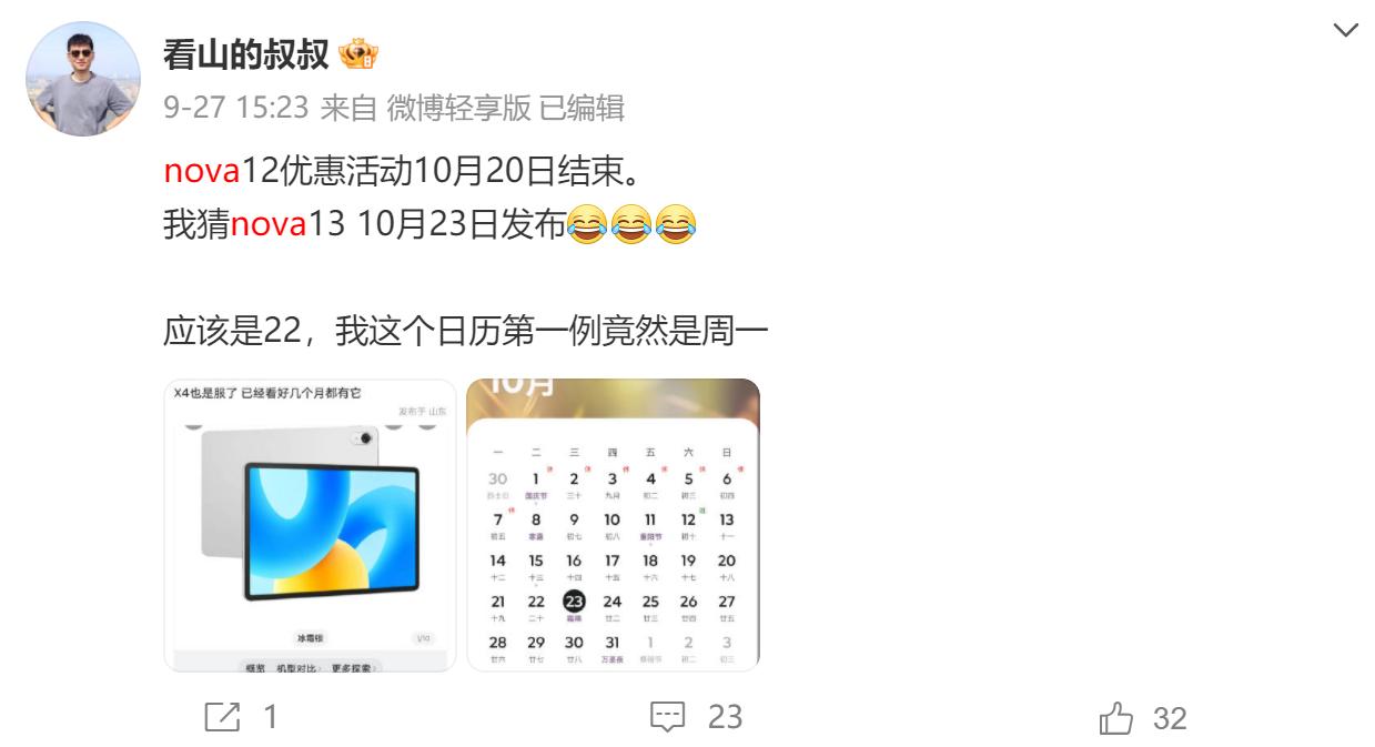 现在华为各类产品的保密程度极高,即便是定位低于Mate和Pura的nova系列,暂时能够确定的信息也不多。据看山的叔叔、数码闲聊站、定焦数码等博主爆料,nova 13系列将于10月22日发布。