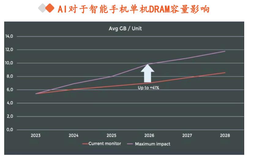 以DRAM为例,随着手机厂商开始在手机产品中融入基于生成式AI的功能,手机单机DRAM搭载容量将逐步提升,根据Yole预测数据,2023年高端智能手机的平均DRAM容量为9GB,预计到2024年高端智能手机的平均DRAM容量将接近10GB。另外,搭载16GB 内存的高端智能手机(足以满足70亿参数LLM运行需求)市场份额有望从2023年的8%增长到2024年的11%(摘自平安证券报告)。
