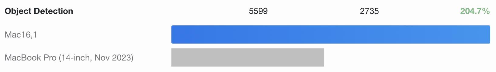 即使和拥有更多处理器核心、更大内存的 M3 Pro 机型相比,M4 MacBook Pro 的表现同样出色。得益于更高的频率(M4 基准频率为 4.41GHz,M3 Pro 基准频率为 4.05GHz),M4 MacBook Pro 在单核测试中的分数成功超越 M3 Pro 机型,有着 20.5% 的提升,其中物件识别单元的分数同样是遥遥领先。
