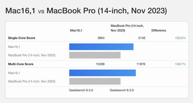 但在多核测试中,M3 Pro 机型用更多的核心数追上了 M4 机型的成绩——M4 机型分数仅比 M3 Pro 高了 6.4%,差距几乎可以忽略不计。