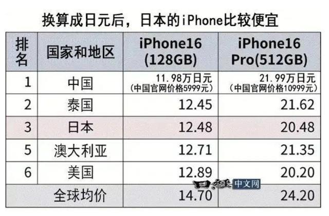 如上图所示,这是日本媒体整理出来的,全球iPhone16售价的排行榜,在入门款的128GB的iPhone16上,中国最低,标价5999元,相当于11.98万日元。
