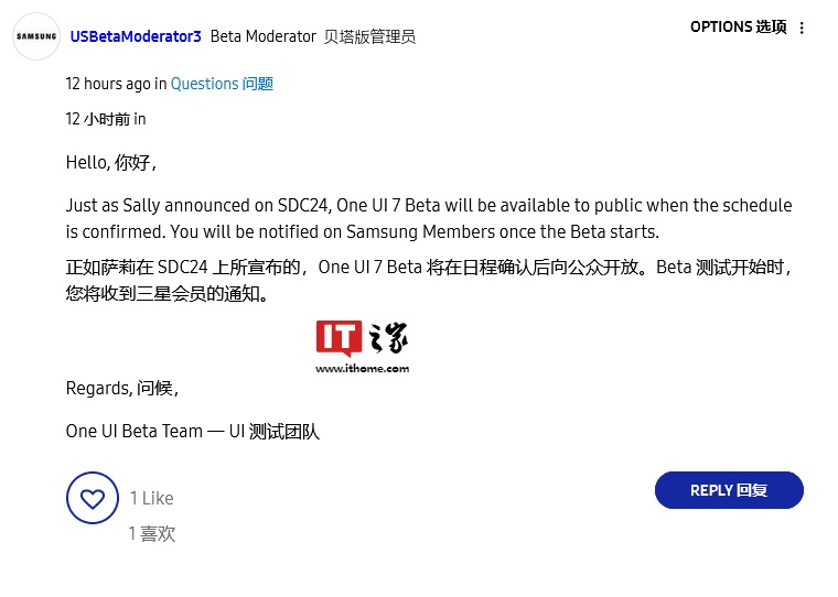 不过有一点值得关注的是,三星此前表示 One UI 7 Beta 测试项目仅向开发者开放,而最新版主回复中表示 One UI 7 测试版将不限于开发者。