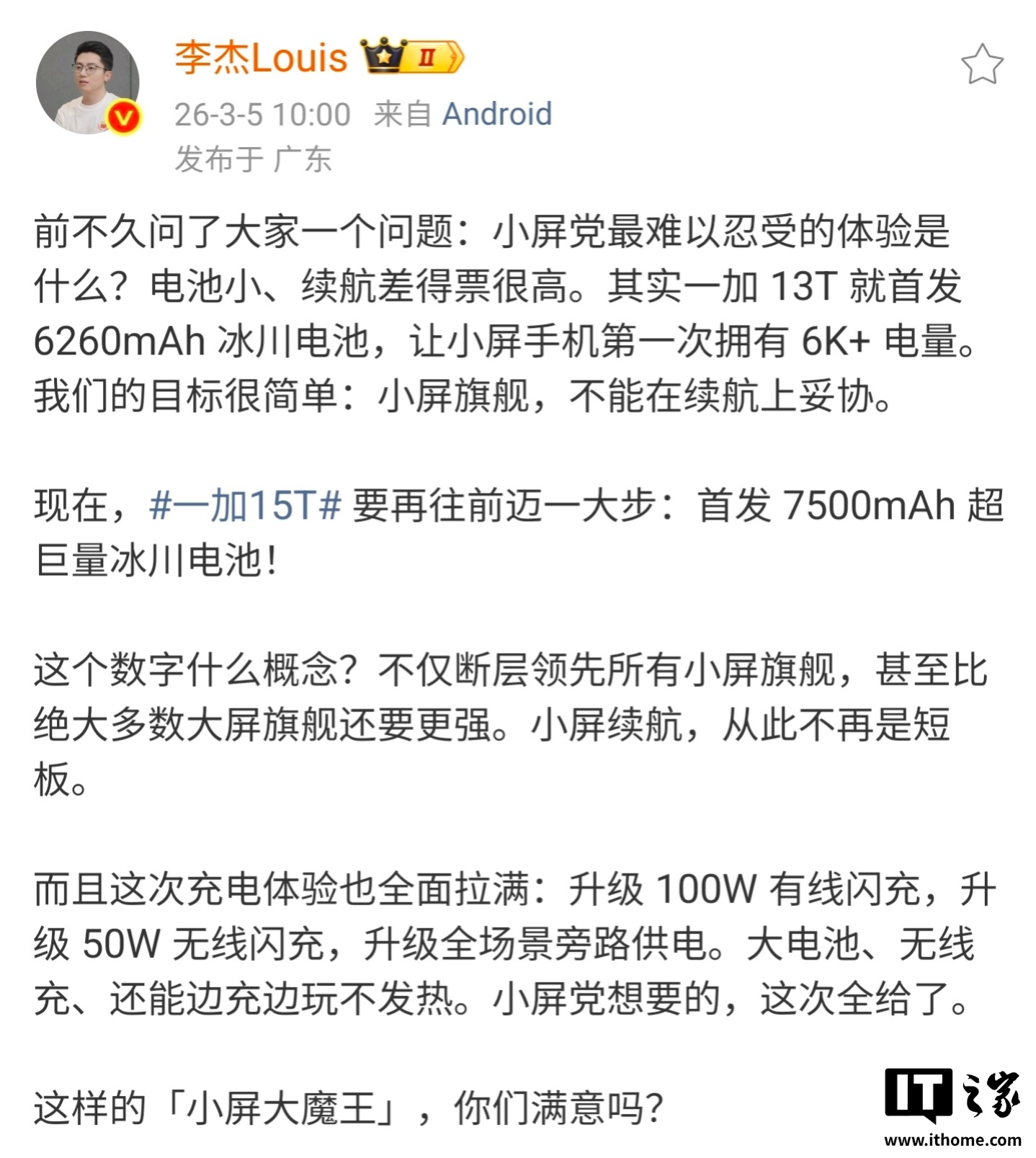 IT之家 3 月 5 日消息,一加中国区总裁李杰今日透露,一加 15T 首发 7500mAh 超巨量冰川电池。此外,充电体验也全面拉满:升级 100W 有线闪充,升级 50W 无线闪充,升级全场景旁路供电。