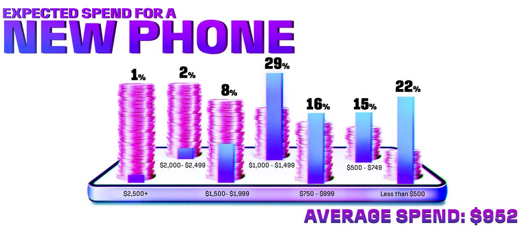 - 29%的美国成年人计划在手机升级上花费1000至近1500美元,而22%的人则计划花费低于500美元。